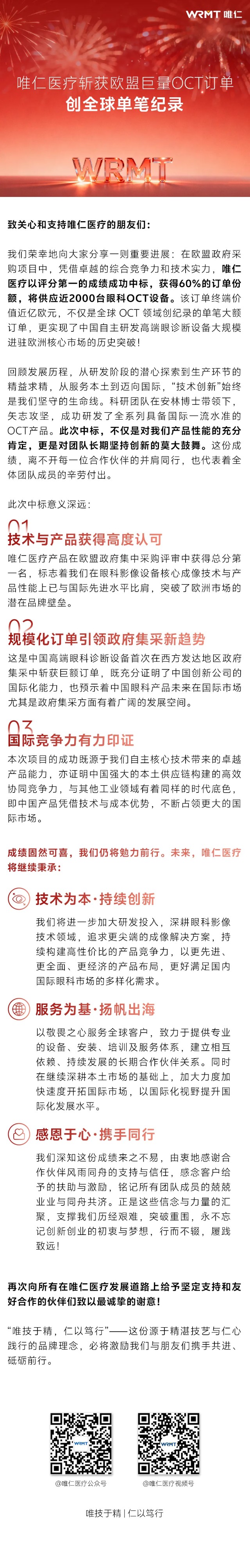 闪耀欧陆!唯仁医疗斩获欧盟巨量OCT订单,创全球单笔纪录!